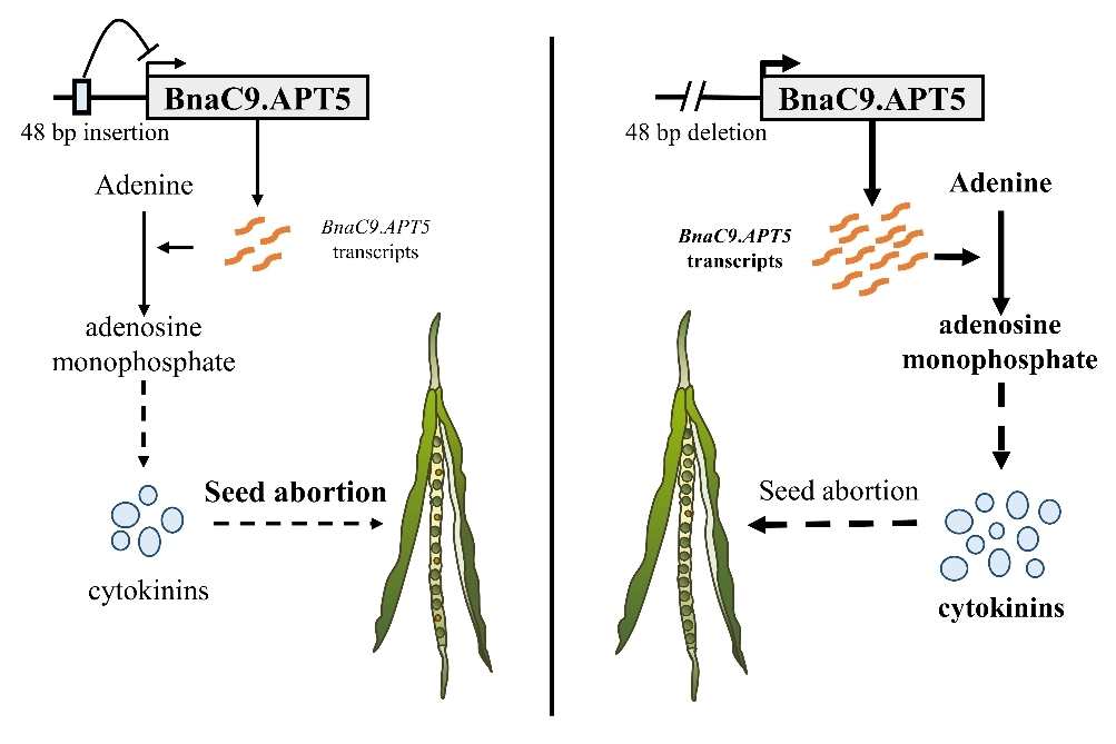 本研究提出了一个工作模型:当BnaC9.APT5启动子中存在48bp插入时,BnaC9.APT5的转录受到抑制,导致5'-腺嘌呤核苷酸和细胞分裂素积累减少,每角果粒数降低;当启动子中存在48bp缺失时,BnaC9.APT5表达上调,促进5'-腺嘌呤核苷酸和细胞分裂素的合成,从而显著提高每角果粒数。