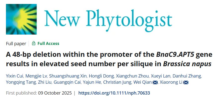 每角果粒数是影响油菜产量的重要农艺性状。油菜每角果粒数是一个典型的数量性状,目前仅少量基因被克隆解析。近日,西南大学油菜资源团队在New Phytologist 上发表了题为 “A 48-bp deletion within the promoter of the BnaC9.APT5 gene results in elevated seed number per silique in Brassica napus”的研究论文。该研究系统揭示了一个腺嘌呤磷酸核糖转移酶基因BnaC9.APT5,通过促进细胞分裂素合成,进而参与调控油菜每角果粒数的分子机制。该研究不仅为油菜每角果粒数调控分子机理提供了新的见解,也为油菜高产分子育种提供新的靶标。