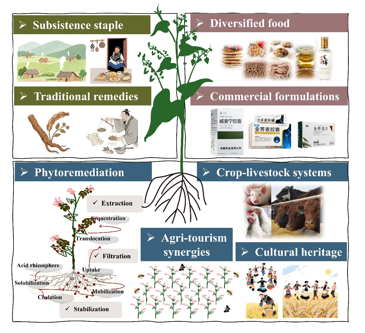 从古时横跨亚欧的传播之路,到今日在全球餐桌与田野间的多元角色,荞麦的功能已远超传统食粮的范畴,实现了从“温饱作物”到“多功能平台”的跨越。在营养与健康领域,作为无麸质的天然功能食品,它被广泛用于面条、茶叶及烘焙产品,其药用价值在传统医学与现代研究中均得到印证,具有抗炎、抗氧化、降三高等多重功效;在生态农业层面,荞麦能高效利用土壤中的磷,减少化肥依赖;其花朵是极佳的蜜源,能吸引并维持田间益虫种群,增强生态系统服务功能;同时,荞麦还具备强大的土壤重金属修复潜力;此外,以荞麦花海为特色的农旅融合、以其提取物开发的化妆品与生物可降解材料,正不断拓展其应用的边界。